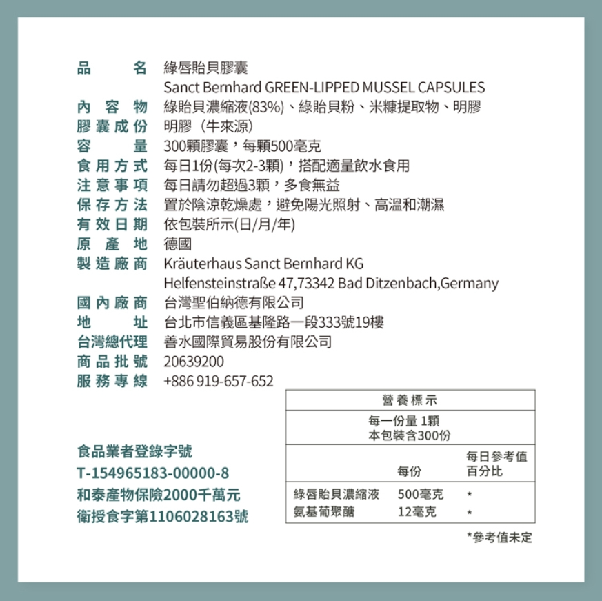 成分:青口貽貝濃縮液(83%)、明膠、抗結塊劑米糠提取物。