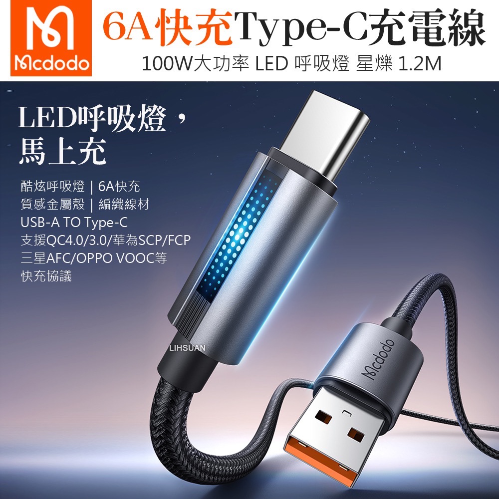 ●酷炫呼吸燈|6A快充|質感金屬殼|編織線材|100W大功率
