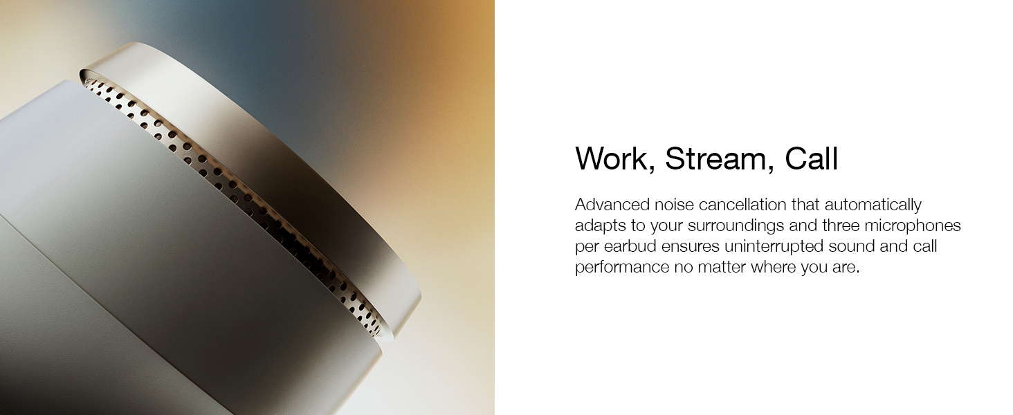 先進的降噪功能可自動適應您的周圍環境,每個耳塞配備三個麥克風,無論您身在何處,都能確保不間斷的聲音和通話性能