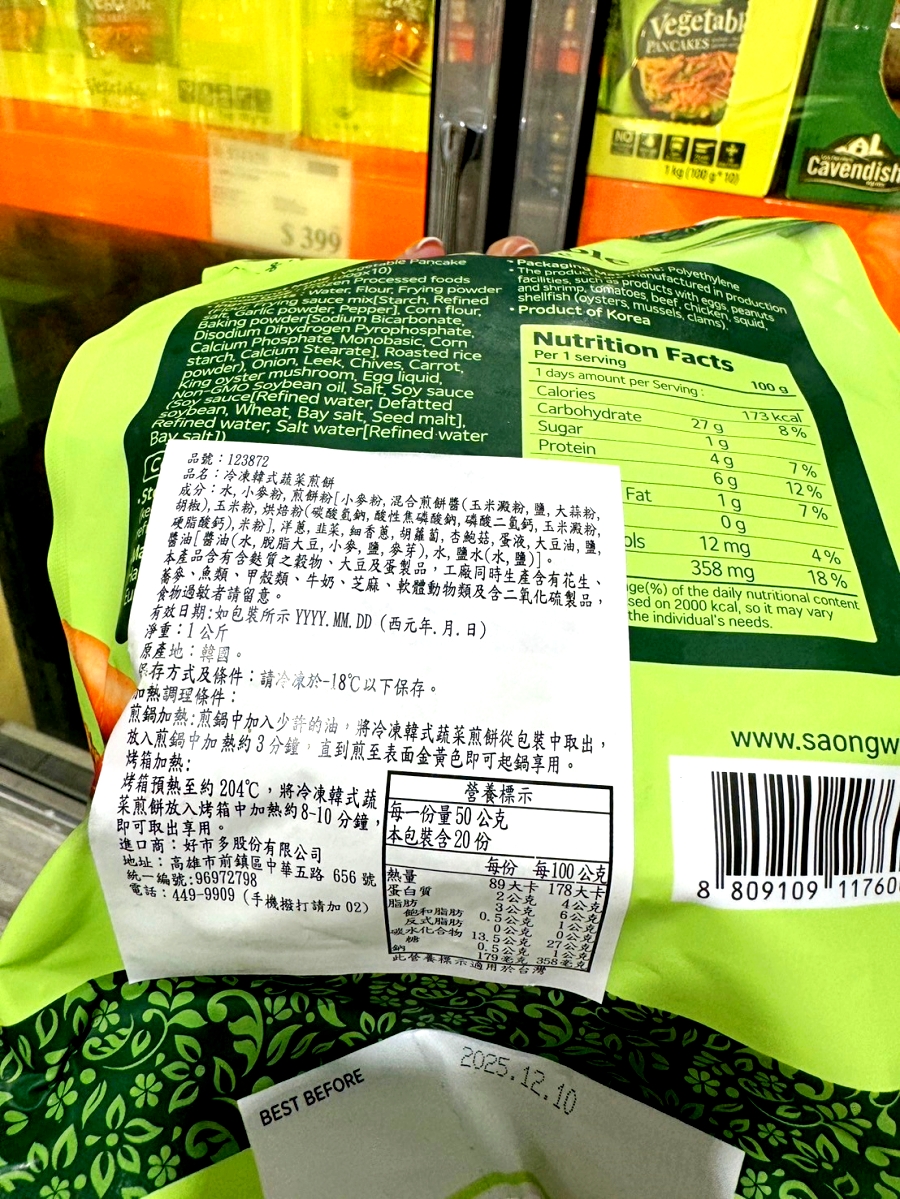 水、小麥粉、煎餅粉[小麥粉、混合煎餅醬(玉米澱粉、鹽、大蒜粉、胡椒)、玉米粉、烘焙粉(碳酸氫鈉,酸性焦磷酸鈉、磷酸二氫鈣、玉米澱粉、硬脂酸鈣)、米粉]、洋蔥、韭菜、細香蔥、胡蘿蔔、杏鮑菇、蛋液、大豆油、鹽、醬油[醬油(水、脫脂大豆、小麥、鹽、麥芽)、水、鹽水(水、鹽)]