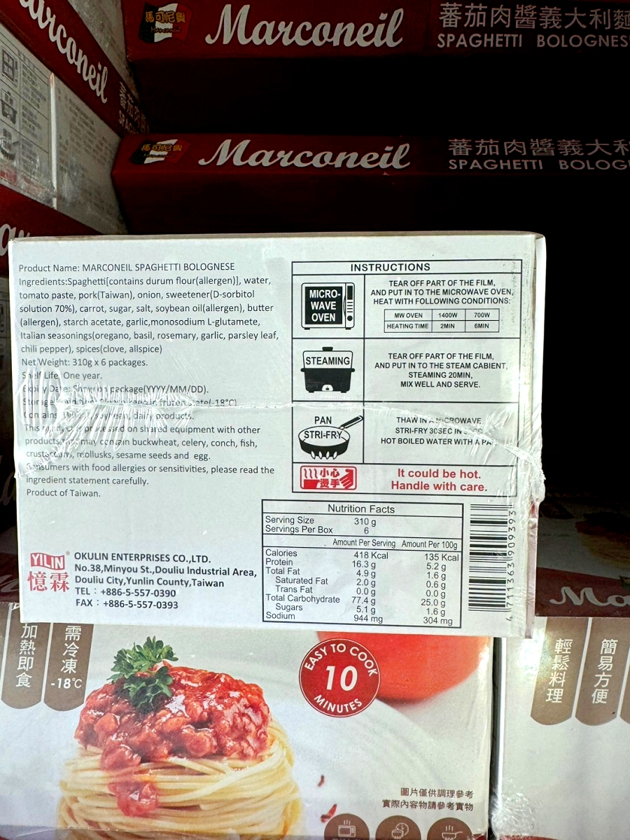 義大利麵、水、蕃茄糊、豬肉、洋蔥、甜味劑、紅蘿蔔、砂糖、食鹽、大豆油、奶油、醋酸澱粉、大蒜、L-麩酸鈉、義大利香辛料