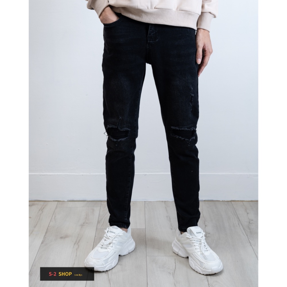 水洗黑褲 膝蓋立體補釘 彈力牛仔長褲