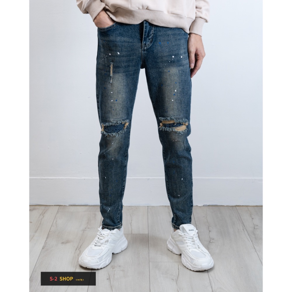 深藍色膝蓋波浪補丁 有車縫 窄版牛仔長褲 彈力長褲