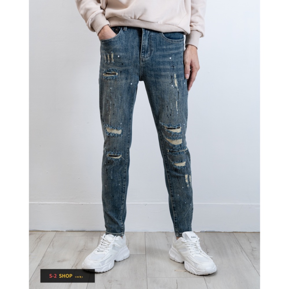 【S2店】潑漆 多重補丁超扎實 深藍色 超帥的 牛仔長褲