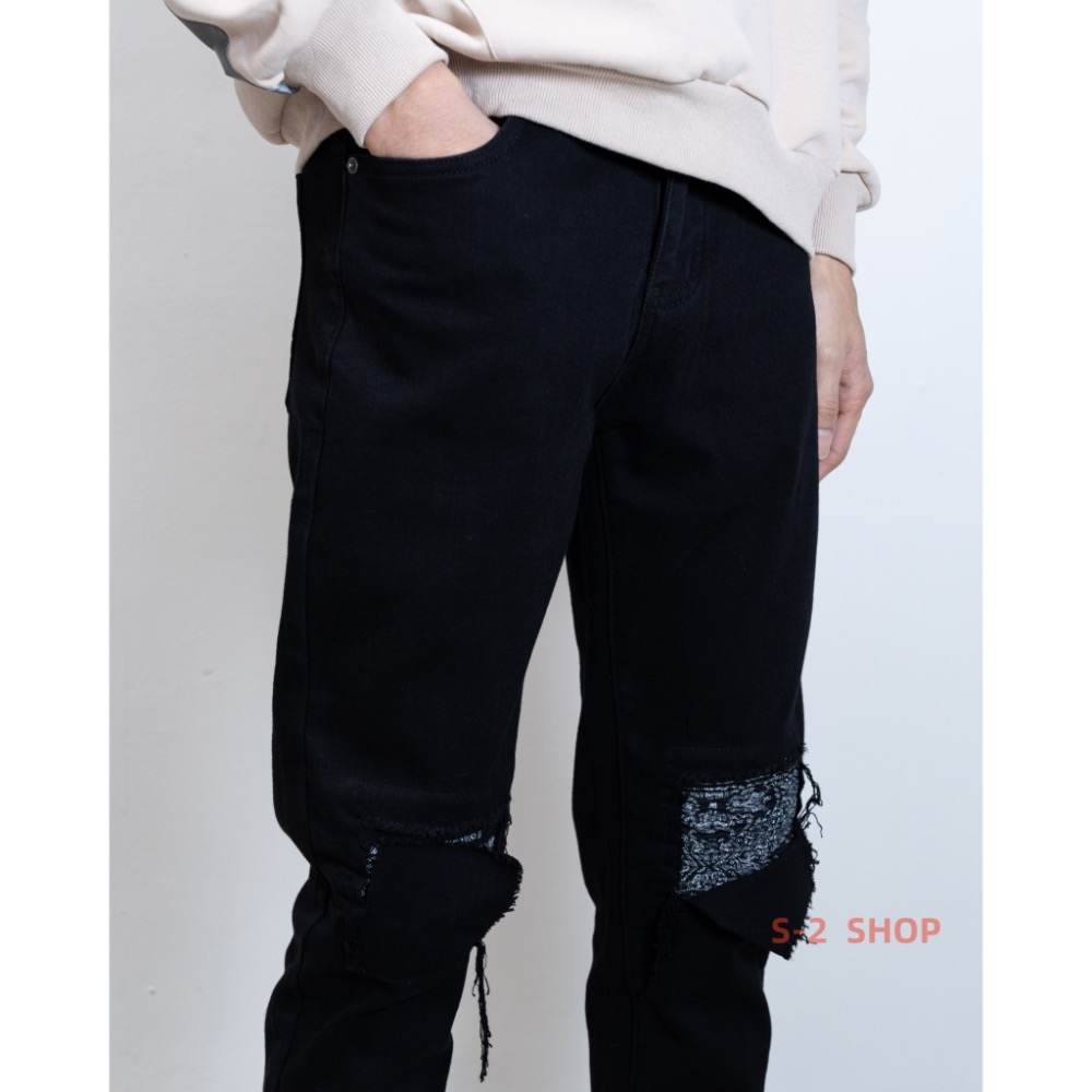 硬挺兩邊膝蓋變形蟲補丁 純黑褲 彈力牛仔長褲