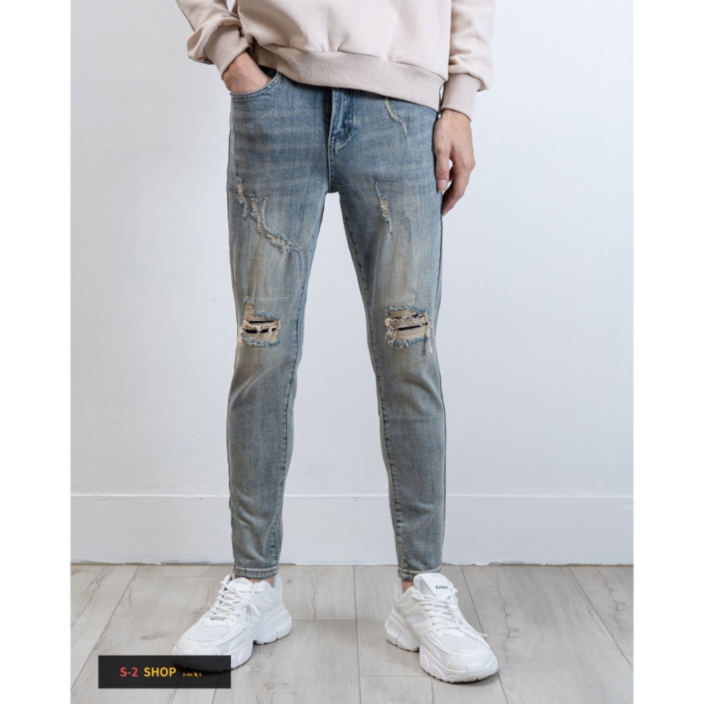 立體貓抓 破壞刷黃 膝蓋牛仔補丁 牛仔彈力長褲