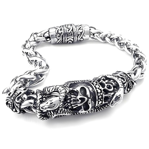 ✅ 暗黑氣場殺:骷髏纏蛇 + 做舊質感,演唱會戴它,隨吉他 solo 揮動手臂,蛇影骷髏瞬間成為「舞台視覺彈藥」;哥特派對配尖頭靴,暗黑符號炸場,路人內心 OS:「這手鍊背後有故事」!
