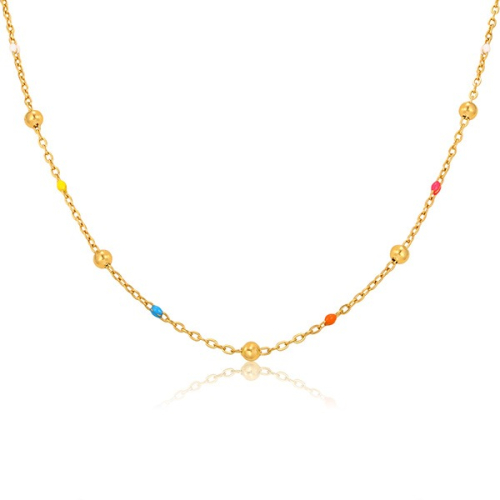 彩點是用高品質烤漆工藝做的,海水濺到、陽光曬都不怕掉色,金色鋼材質也很堅韌,在海邊玩兒的時候跑跑跳跳、和沙子摩擦都沒問題,長久戴下來,項鍊依舊是那副繽紛亮麗的樣子,陪你度過每個活力海邊日。