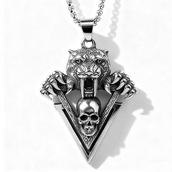 #劍齒虎骷顱頭三角鈦鋼墬子#鈦鋼暗黑野性飾品#硬核叛逆個性吊墬#野性力量日常配飾#暗黑機車聚會佩戴首飾