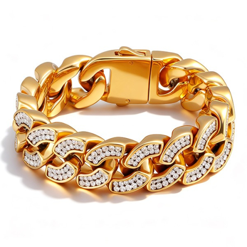 #金色嘻哈滿鑽古巴鏈#鈦鋼金色古巴鏈飾品#潮流氣場日常配飾#滿鑽古巴鏈質感手鍊#輕奢派對夜場佩戴首飾
