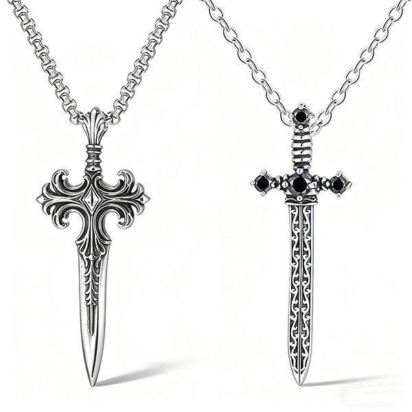 #信仰力量共生飾品#鈦鋼寶劍吊墬#雕花寶劍墜飾#鑲黑鑽寶劍墜#復古主題派對佩戴首飾
