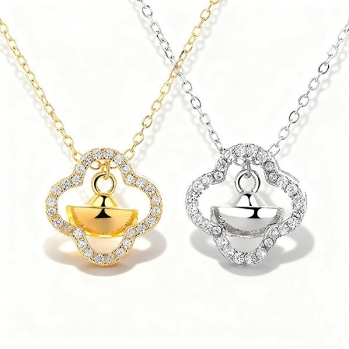 #純銀鎖骨鍊#純銀四葉草元寶吊墜#四葉草招財幸運純銀頸飾#雙色鑲鑽元寶輕奢墜子#閨蜜輕奢下午茶穿搭配飾