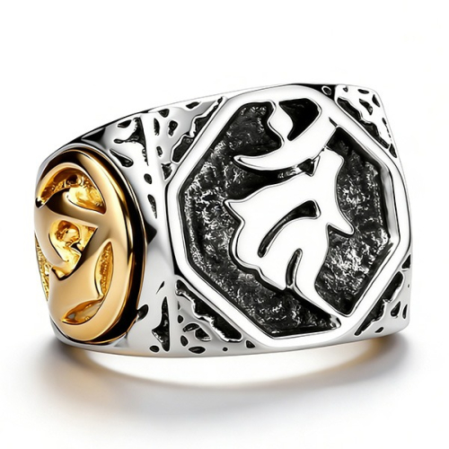 搭做舊工裝外套 + 機能馬甲佩戴,雙色撞色的視覺衝擊與國風紋路的細節,會讓同好主動搭話:「這戒指的國潮氛圍感太強!銀黑做舊 + 鎏金點綴,完全是市集裡的焦點飾品」。