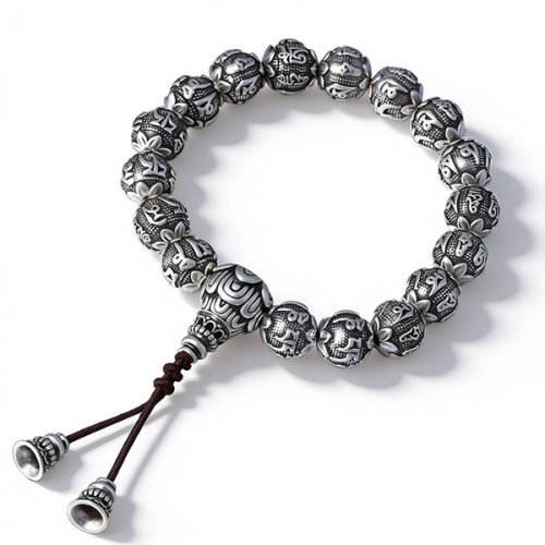 搭棉麻禪服或素色亞麻襯衫佩戴,銀珠的復古肌理與六字真言的文化細節,會讓同好主動搭話:「這手鍊的禪意氛圍感太強!純銀質感細膩,佛紋細節滿滿,茶會戴既莊重又顯內涵」。