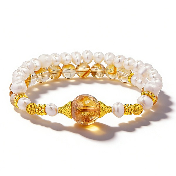 選用圓潤亮澤的天然淡水珍珠),搭配通透金黃的黃塔晶轉運珠(象徵「招財聚氣、事業昇華」),是日常通勤或輕社交場合的「氣質型開運腕飾」。