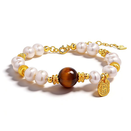 虎眼石的濃郁色澤與珍珠的溫柔光澤形成優雅對比,既能凸顯輕奢質感,又能讓「轉運招財」的吉祥寓意與「溫柔氣質」的穿搭效果雙重加持,是日常通勤、輕社交場合的萬能搭配選擇。