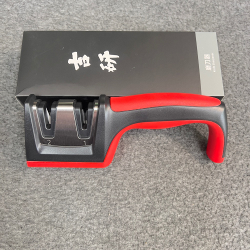 1.先將磨刀器放置在平枱上,一手握穩手柄,另一隻手持