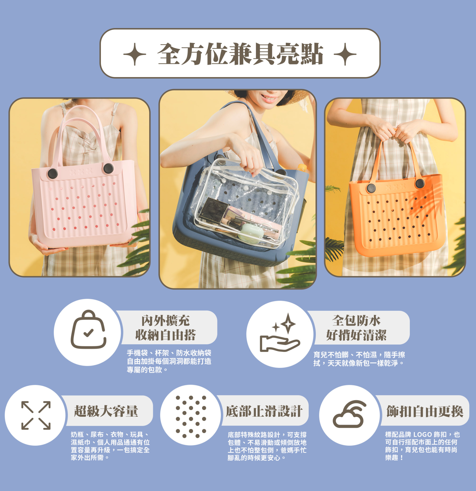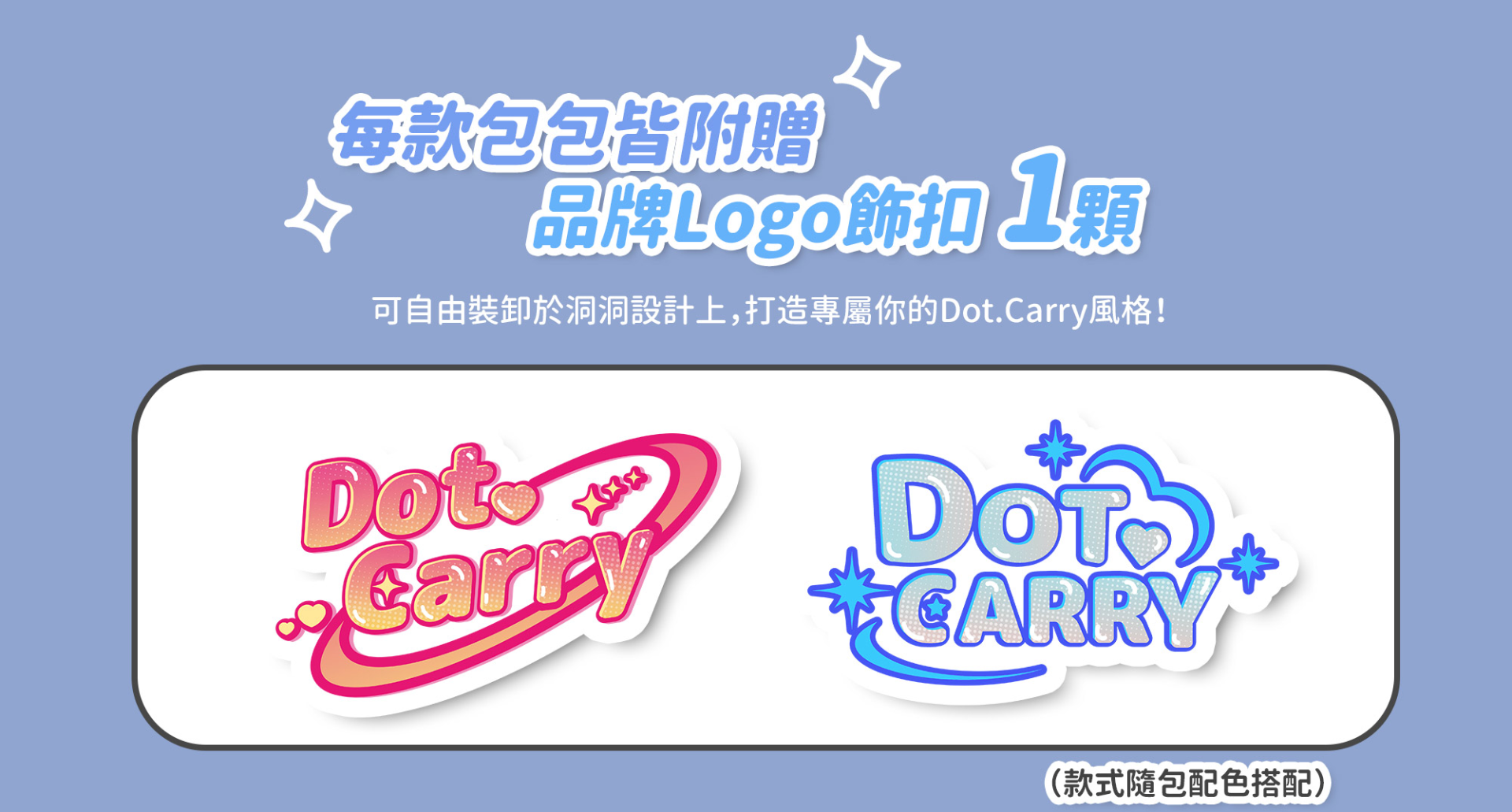 標配品牌 LOGO 飾扣,可再搭配各式飾扣,讓實用與時尚兼具