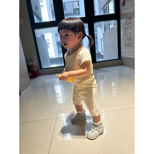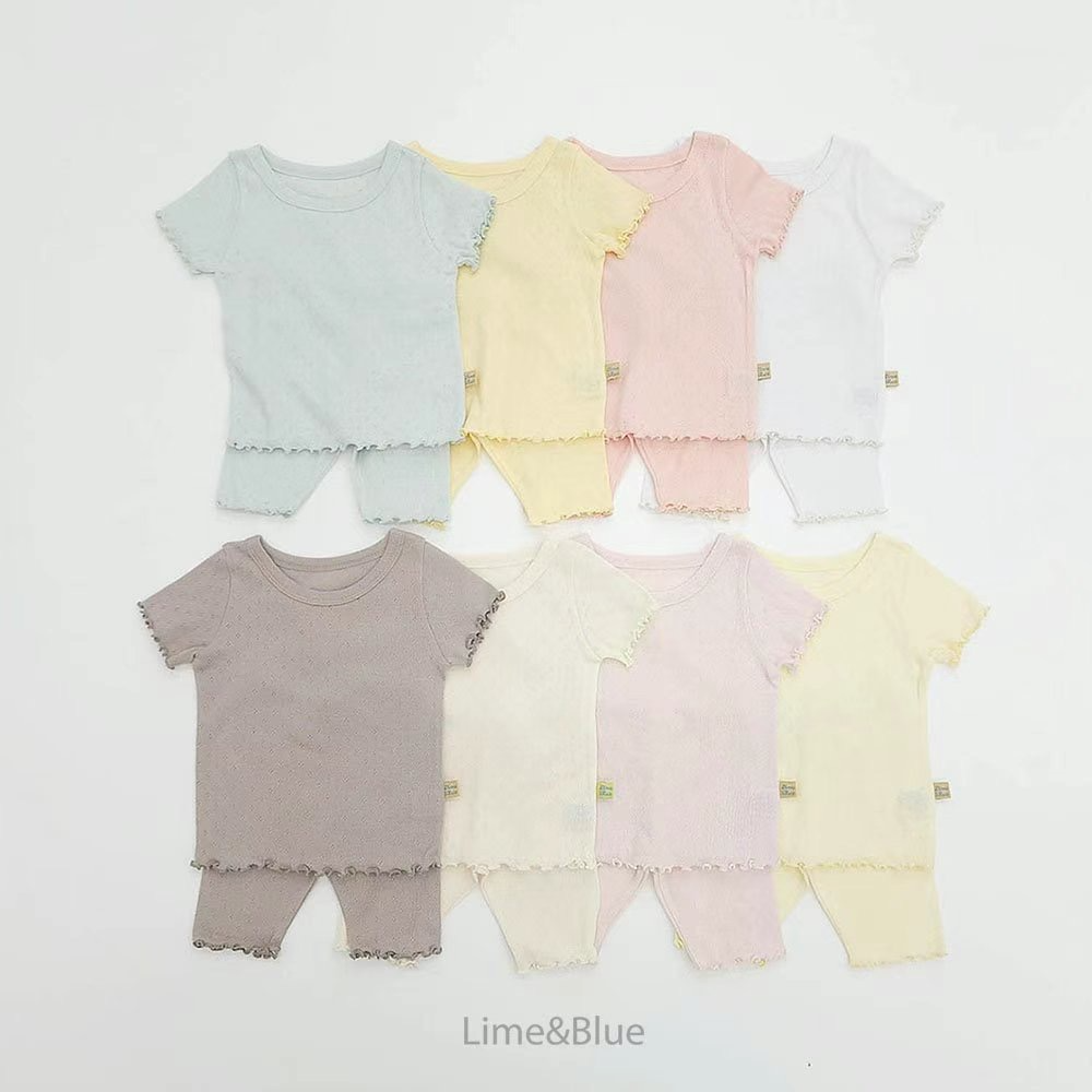 木耳邊,布料有小洞洞,很可愛繽紛的馬卡龍色系,套裝不需要煩惱搭配,是非常薄透透氣的純棉材質,夏天穿完全不悶熱,材質真的很棒喔~