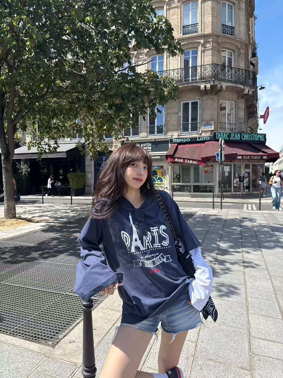 正韓 Paris巴黎袖子撞色T恤 藍色 現貨