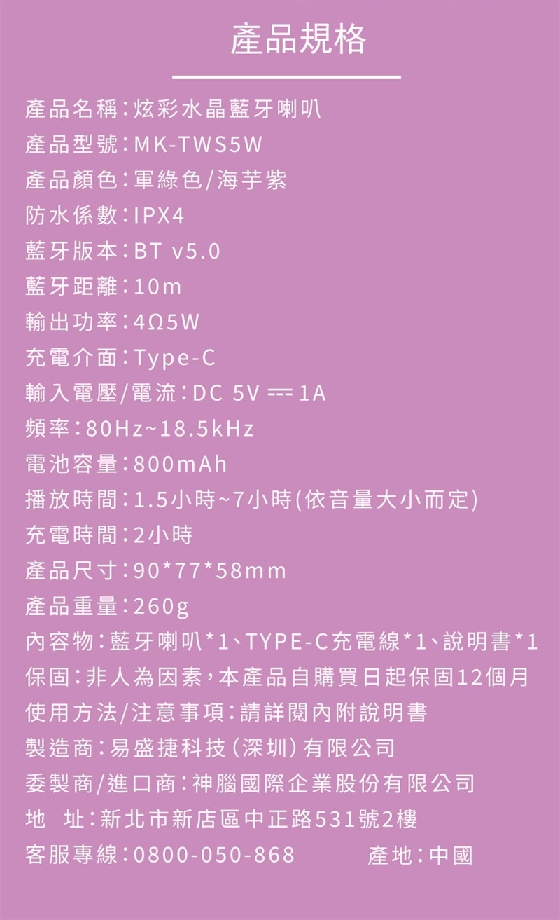 - 藍牙版本:5.0