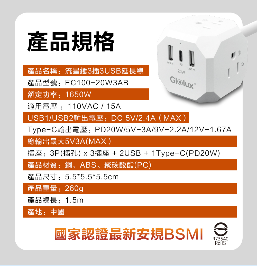 3孔3P插頭+2USB+1Type-C(PD20W)