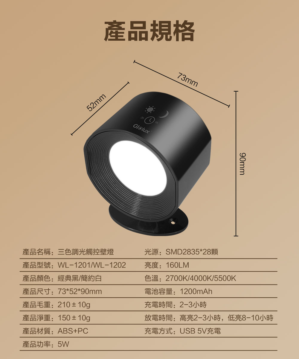【7-ELEVEN 門市團購】【Glolux 北美品牌】三色調光觸控壁燈 2入組 (2色可選:黑色/白色)