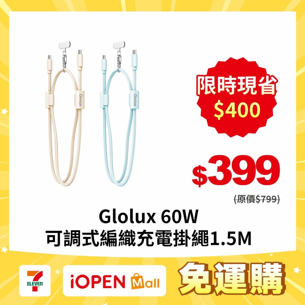 【7-ELEVEN 門市團購】【Glolux】60W 1.5M傳輸 快充線 可調式編織掛繩 馬卡龍色 充電掛繩