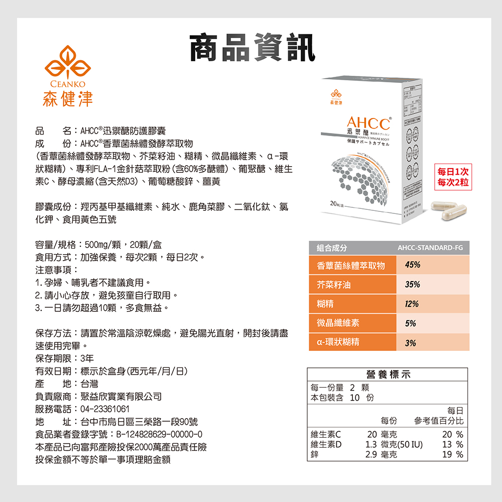 森健津 AHCC迅禦醣膠囊 20顆/盒(權威認證╳免疫後盾)