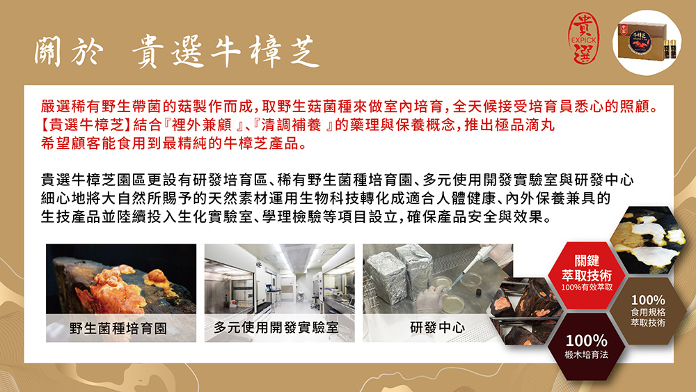 貴選牛樟芝園區更設有研發培育區、實際培育園、多元使用開發實驗室與研發中心,細心地將大自然所賜予的天然素材運用生物科技轉化成適合人體健康、內外保養兼具的生技產品,並陸續投入生化實驗室、學理檢驗等項目設立,確保產品安全與效果。