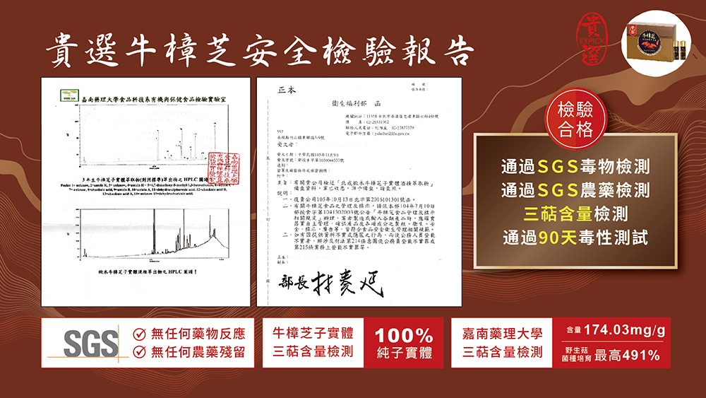 通過牛樟芝子實體、三萜含量檢測→100%純子實體