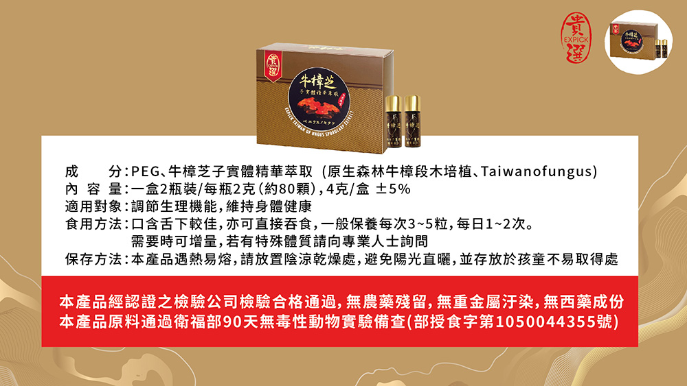 成    分:PEG、牛樟芝子實體精華萃取  (原生森林牛樟段木培植、Taiwanofungus)