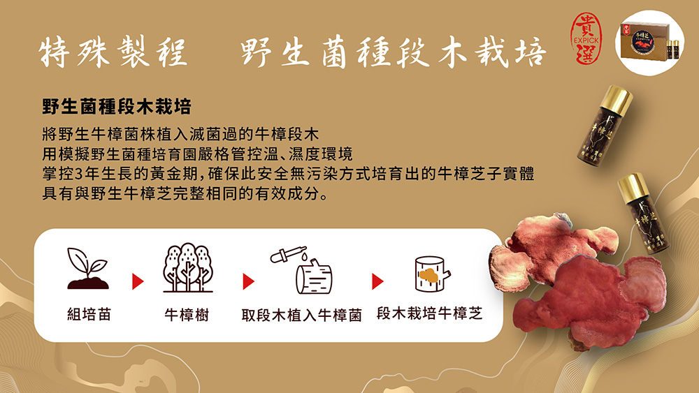 野生菌種椴木培養,並經過無毒測試,比一般的菌種椴木培養三帖含量高出三倍