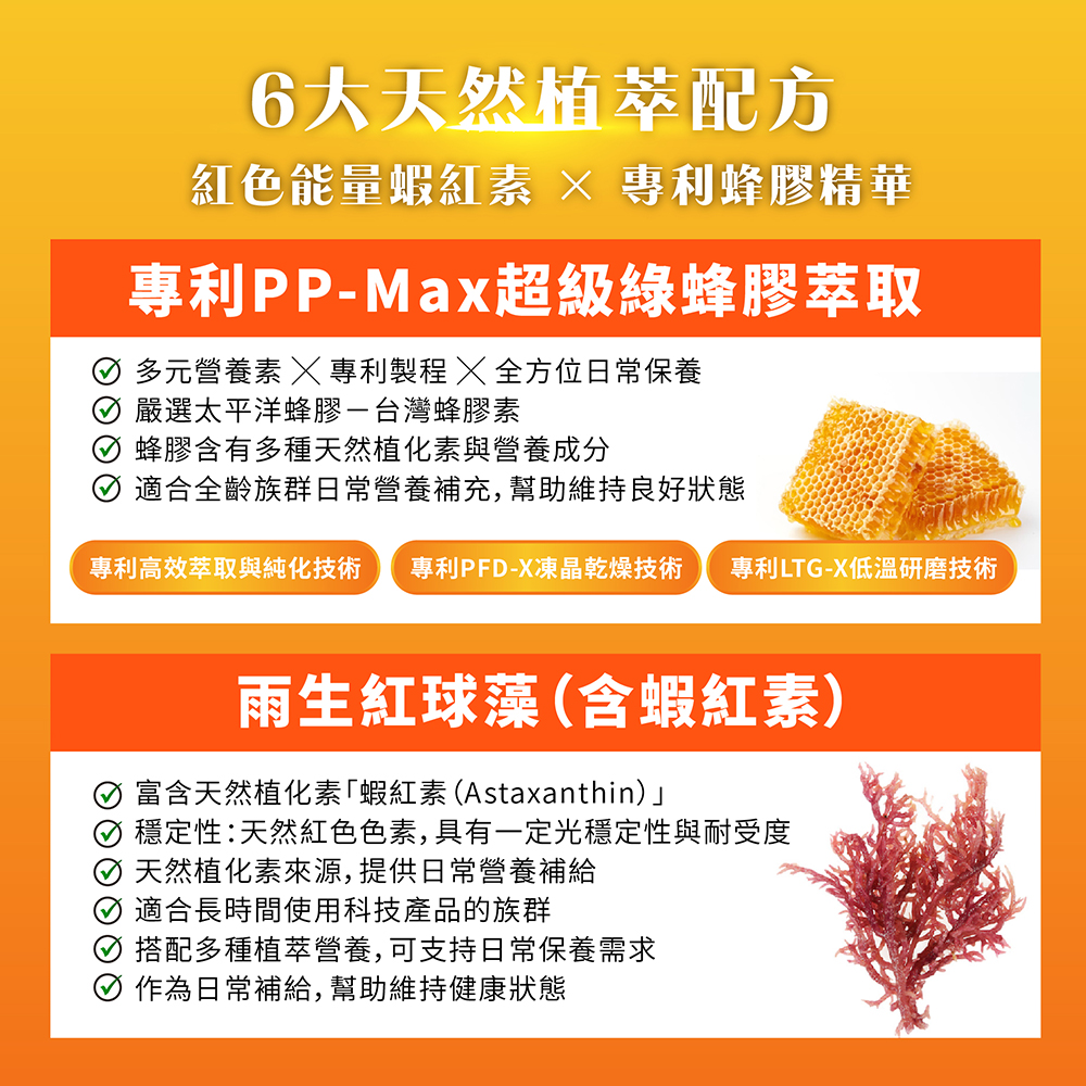 ✔ 雨生紅球藻(含蝦紅素):天然抗氧化來源,提供日常保護。