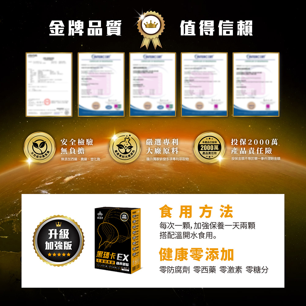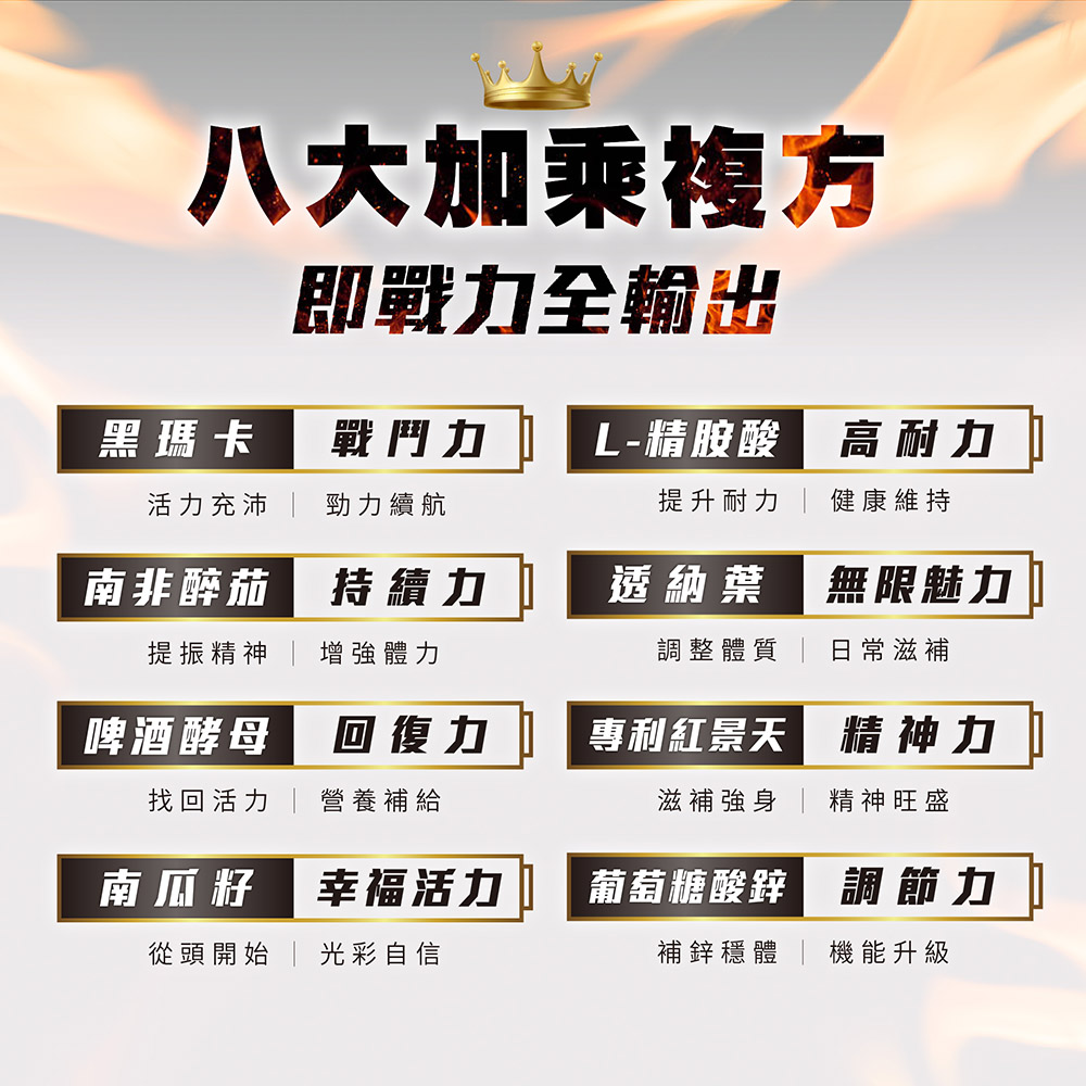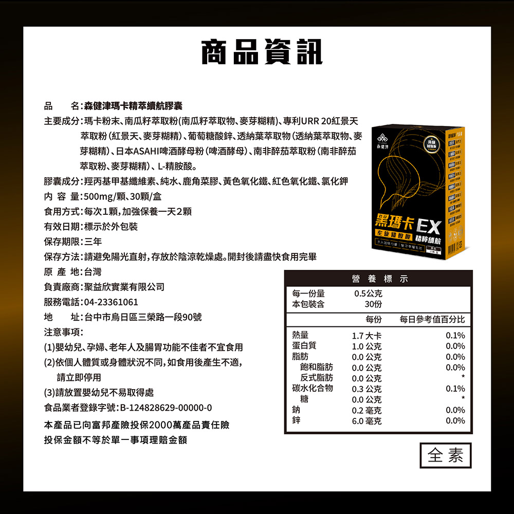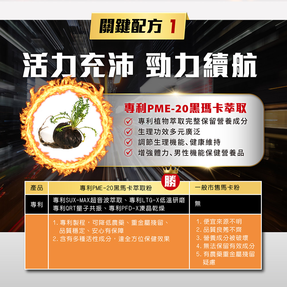 ✔ 專利祕魯黑瑪卡:植物性營養來源,增強體力、男性機能保健。