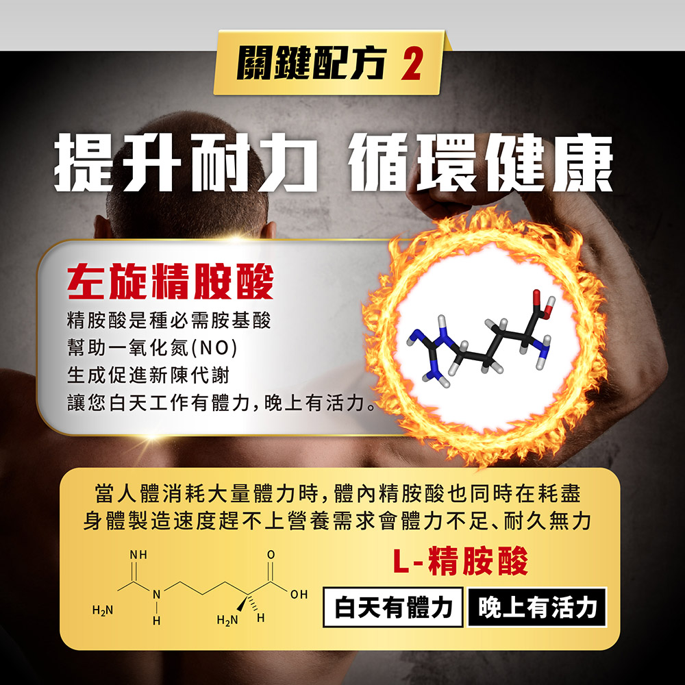 ✔ 左旋精胺酸:天然胺基酸來源,促進一氧化氮生成。