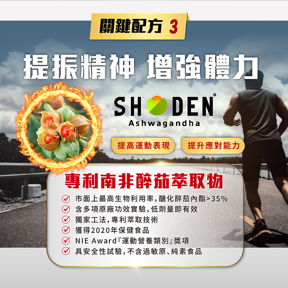 ✔ 南非醉茄萃取:高生物利用率,獲NIE運動營養獎,含植化素。