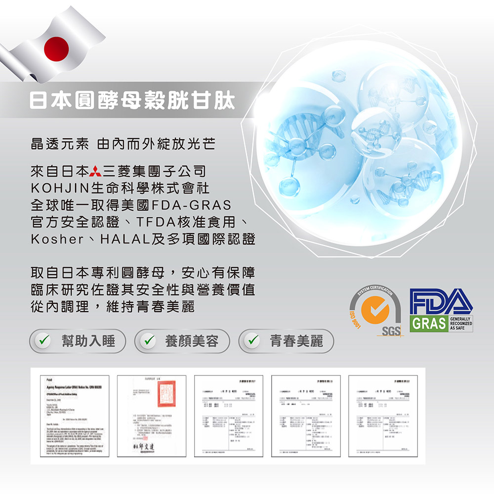 ✔ 日本圓酵母穀胱甘肽:專利來源成分,適合日常保養。
