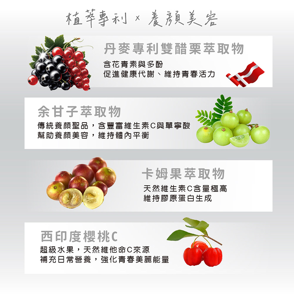 ✔ 卡姆果萃取物:富含維生素與礦物質,養顏美容。