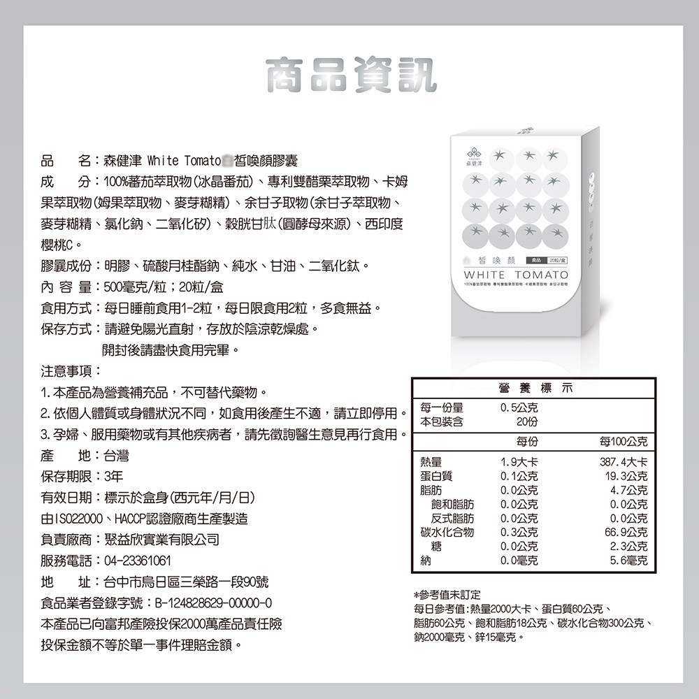 森健津-冰晶番茄喚顏膠囊 養顏美容 青春美麗 冰晶番茄 榖胱甘肽 余甘子取物 卡姆果萃取 西印度櫻桃C 雙醋栗萃取