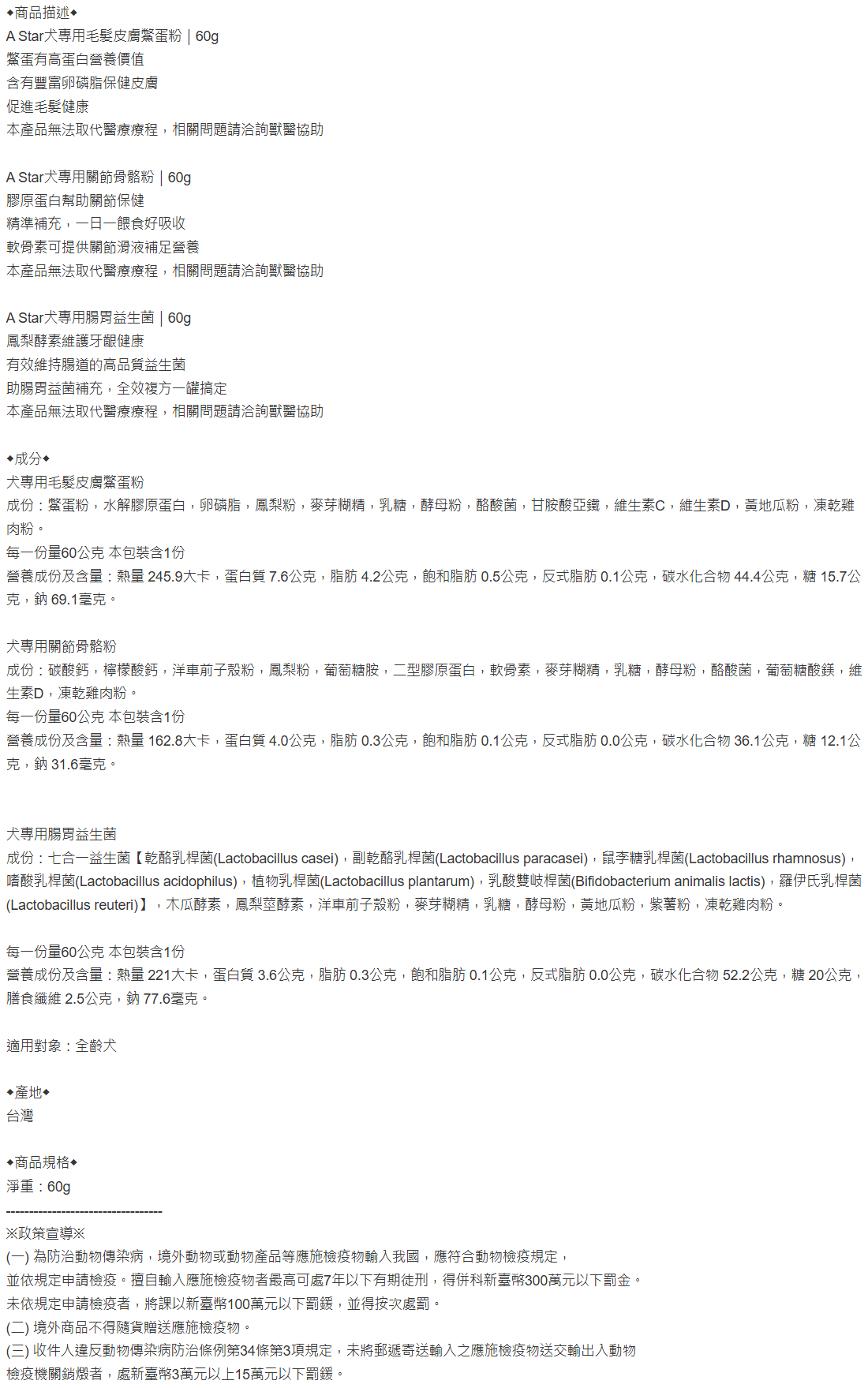 AStar 犬專用關節骨骼粉/腸胃益生菌/毛髮皮膚鱉蛋粉 60g/罐 一日一餵食好吸收 保健品 營養品