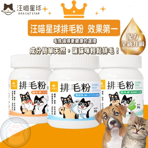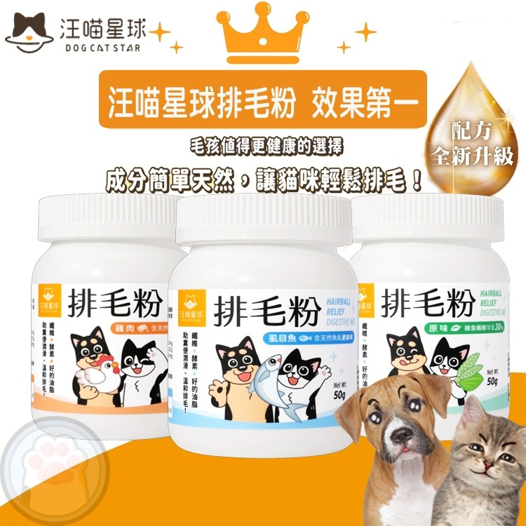 汪喵星球排毛粉成分為天然纖維與消化酵素、天然魚油&亞麻仁油,可幫助維持腸道健康及幫助糞便潤滑。雖然狗狗沒有頻繁舔毛的習性,但若玩耍時食入大量毛髮,還是可以補充排毛粉來幫助排除毛髮及幫助腸胃蠕動喔。