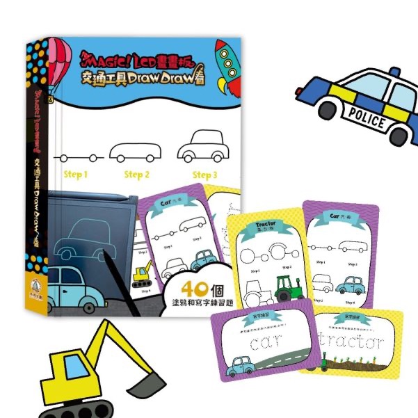 附有20張雙面認知卡,一面跟著分解示範,四個步驟就能畫出超有趣的交通工具;另一面學習20種交通工具的英文,並且有標示英文字母筆順,讓孩子能跟著箭頭的方向,寫出漂亮又正確的英文;另外還有正方形、半圓形等多種形狀的英文,學習形狀的英文又能學會如何畫,兼具塗鴉和寫字練習功能!