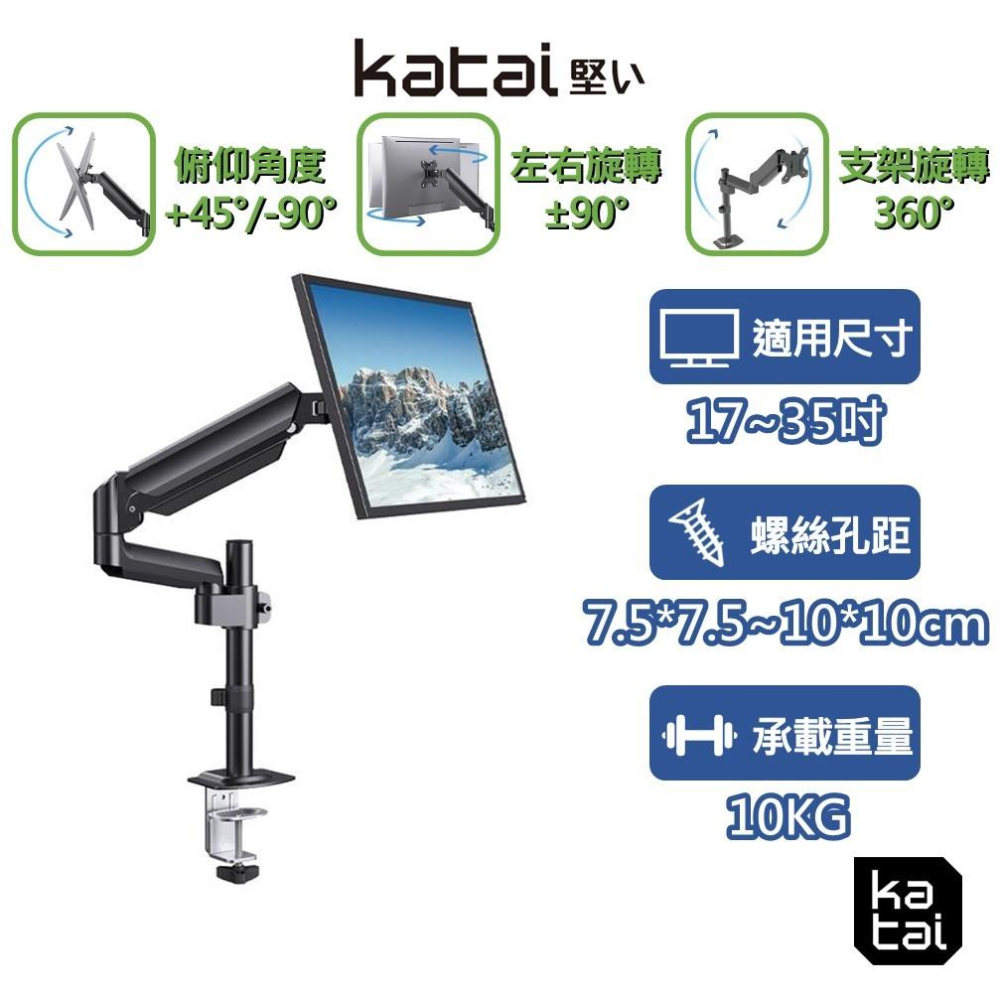 katai 17-35吋氣壓式螢幕架 桌上型螢幕架【桌孔式/桌夾式】【H100升級款】螢幕架 電腦架 ITW-S100