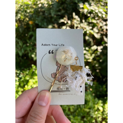 每個髮夾內花材都會適季節大小不同,手工製作的暈染效果也不同。故每一個髮夾都是只屬於你獨一無二的寶物。