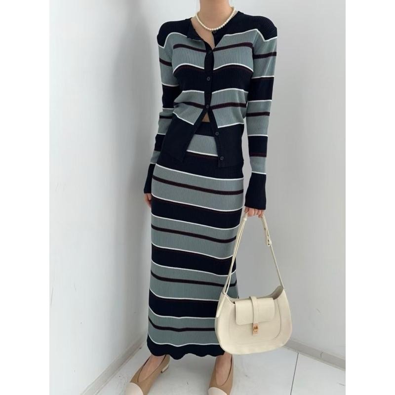黑色外套最後現貨 N026正韓🇰🇷 時尚條紋針織上衣半身裙套裝