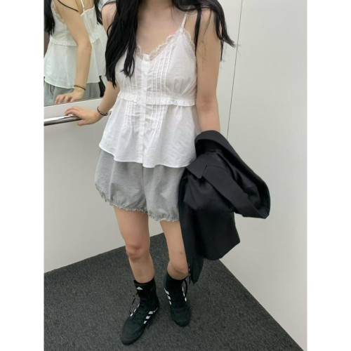 白現貨 O007 正韓🇰🇷 v領蕾絲排釦傘擺背心