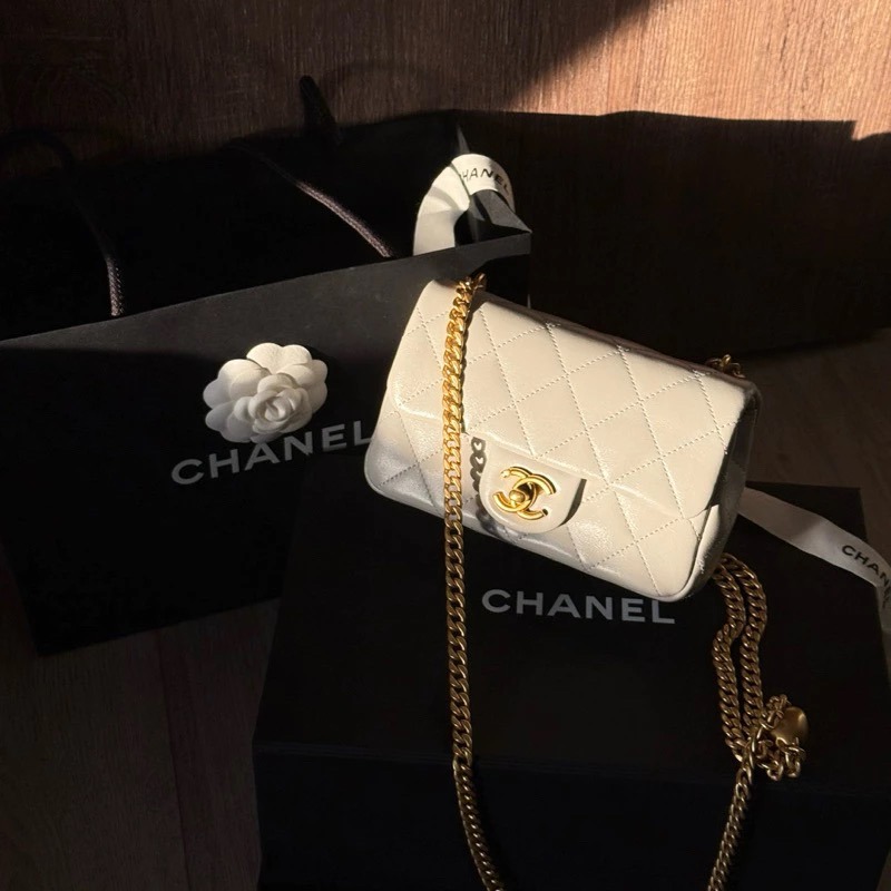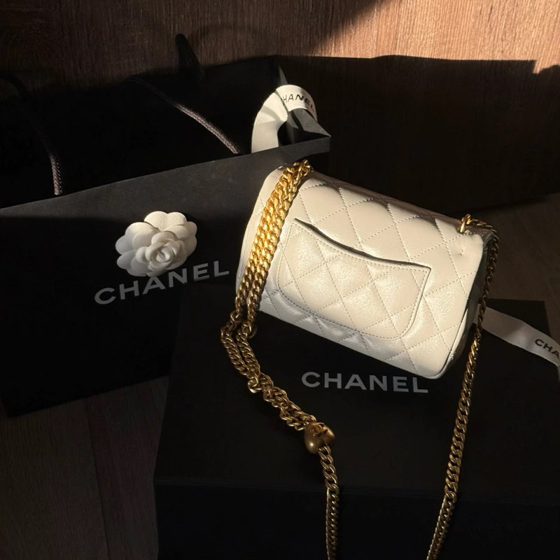 【現貨在台實拍】Chanel Flap 灰白色皮革愛心金球肩背包|ASCE精品代購