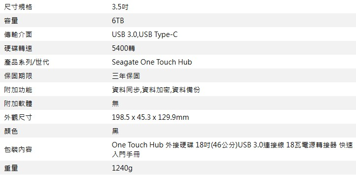 SEAGATE One Touch Hub 3.5吋 6TB 外接硬碟