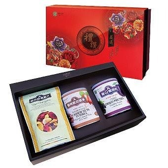 內容包裝:整盒包含綜合菇果脆片120公克/包、鹽烤脆皮腰果250公克/罐、蜜棗乾300公克/罐。